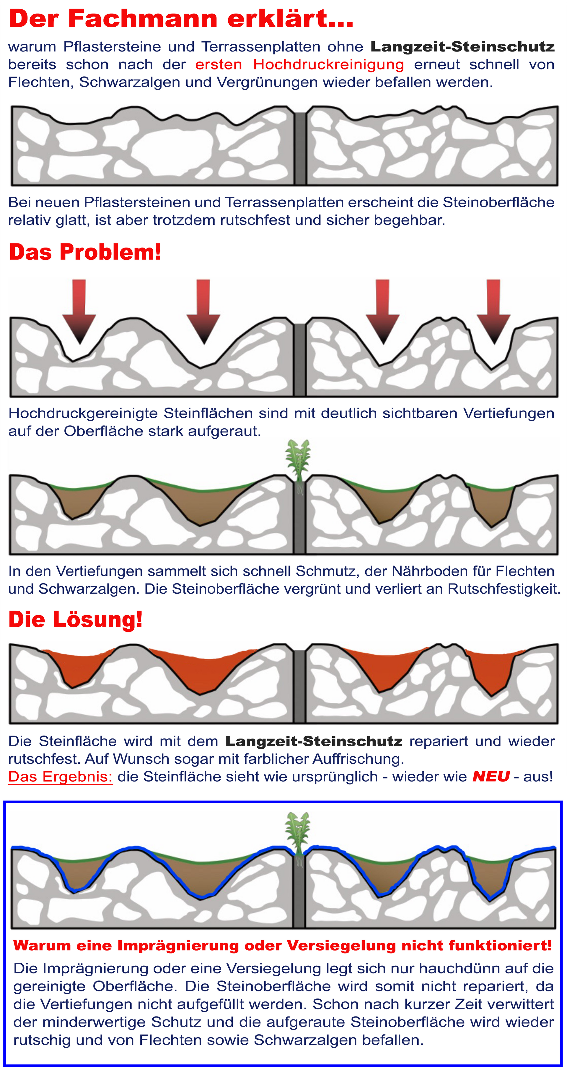 Unsere Kunden erhalten nicht nur einfach eine mit Hochdruck gereinigte Steinfläche, die nach kurzer Zeit wieder von Flechten und Schwarzalgen befallen wird, sondern einen dauerhaften Steinschutz mit Langzeitwirkung und damit eine dauerhaft pflegeleichte Steinfläche. Das bedeutet, dass unsere Kunden zukünftig für die Instandhaltung ihrer Steinflächen keinen Hochdruckreiniger mehr brauchen. Beeindruckende Referenzen finden Sie in unserer Bildergalerie.