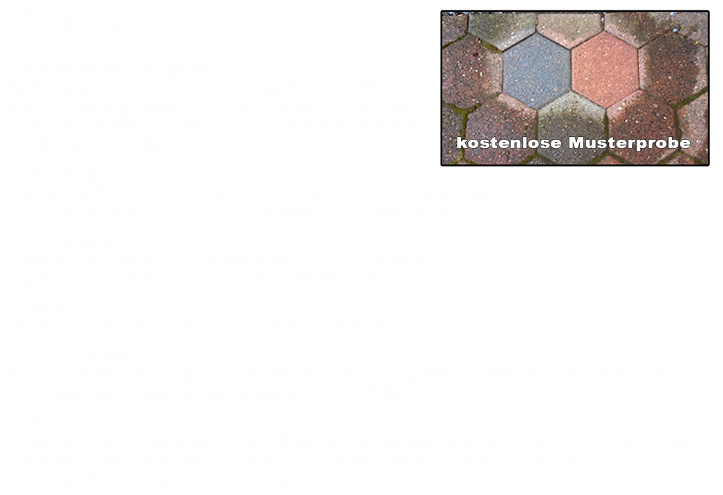 Wir reinigen, sanieren und pflegen Steinflächen von Hofeinfahrten, Terrassen, Gartenwege und Mauern aus Betonstein, Waschbetonplatten, Klinker, aber auch Hartgesteine und Natursteine aus Sandstein, Granit u.v.m. rund ums Haus.